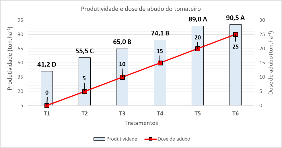 Um Engenheiro Agrônomo conduziu uma pesquisa avaliando a produtividade do tomate em função de diferentes doses de adubo orgânico. O delineamento experimental utilizado foi em blocos casualizados, com 6 tratamentos e 4 repetições. O profissional, ao realizar a análise de variância (ANOVA) verificou que houve efeito significativo entre os tratamentos (p≤0,05). Sendo assim, as médias foram comparadas pelo teste de Scott-Knott a 5% de significância, conforme resultados apresentados no Gráfico abaixo.