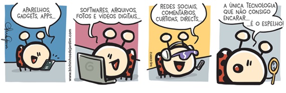 GOMES, Clara. Dilema Tecnológico. Bichinhos de Jardim. Charge. 13, set. 2023. Disponível em: http://bichinhosdejardim.com/wp-content/uploads/2023/09/bdj-230912-web.png. Acesso em: 12 abr. 2024. Com base no estudo sobre Tecnologia, da Unidade 2, do Livro Digital, avalie as afirmações a seguir. I. Por meio do comentário do personagem da charge, podemos inferir que aparelhos tecnológicos, aplicativos e gadgets são impossíveis de acessar. II. Atualmente, os aparelhos tecnológicos pequenos e inteligentes são geralmente usados nas tarefas diárias, como meio de entretenimento ou comunicação. III. Na charge, podemos inferir, por meio da metáfora do espelho, que o personagem tem mais facilidade em lidar com aparelhos tecnológicos do que no desafio de enxergar verdades emocionais e psicológicas sobre si. É correto o que se afirma em: |