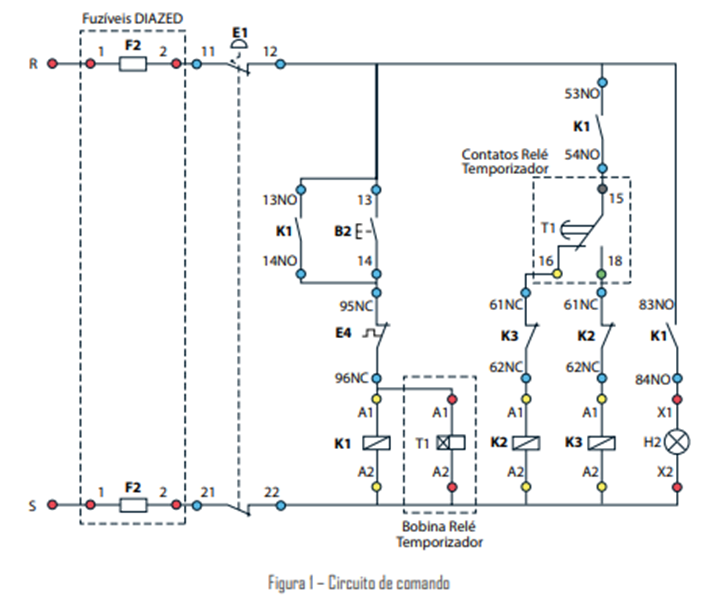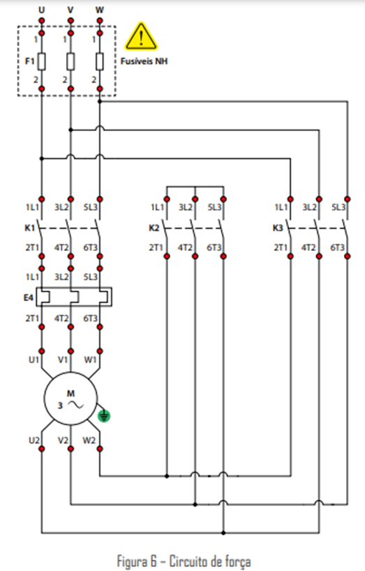 PRIMEIRA TAREFA: DIMENSIONAMENTO DE CONDUTORES A partida estrela-triângulo é um método utilizado para iniciar a operação de motores elétricos trifásicos de indução. Essa técnica é comumente empregada em motores de grande porte, nos quais a corrente de partida pode ser significativamente alta, podendo causar problemas como quedas de tensão na rede elétrica e desgaste excessivo do motor. A partida estrela-triângulo envolve duas etapas distintas: a partida em estrela e a mudança para a configuração em triângulo. Aqui está uma breve descrição de cada etapa: Partida em Estrela: Na fase inicial, os enrolamentos do motor são conectados em estrela (também conhecido como ligação em Y). Mudança para Triângulo: Após um determinado período (geralmente alguns segundos), o sistema muda automaticamente para a configuração em triângulo. A principal vantagem da partida estrela-triângulo é a redução da corrente de partida inicial, diminuindo o estresse tanto para o motor quanto para a rede elétrica. Isso é especialmente útil em situações em que a demanda de corrente no momento da partida pode ser um problema. Vale ressaltar que a partida estrela-triângulo é mais comum em motores de média e alta potência, e seu uso pode depender das condições específicas do sistema elétrico e das características do motor. Fonte: o autor. Dessa forma, monte uma partida estrela triangulo equivalente ao diagrama a seguir e responda às seguintes questões: 3 – Montagem e Operação: a) Realize a montagem prática da partida estrela-triângulo com os componentes disponíveis. Forneça uma foto ou esquema da montagem com os contatos do circuito devidamente identificados.